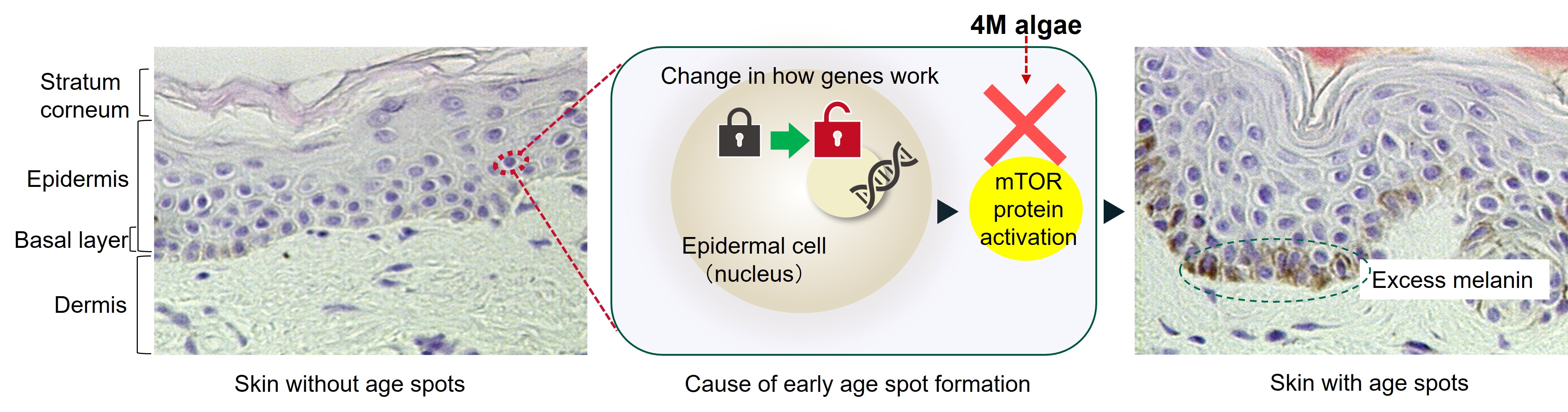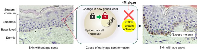 Shiseido has identified, through its unique epigenetic research, the cause of early age spot formation, which begins at the gene level. The overproduction of melanin in melanocytes located in the basal layer of the epidermis has been regarded as the primary cause of age spots. In this study, the activation of the “mTOR protein”*1 due to acquired changes in the epidermis was recognized as a potential cause of age spots at an earlier stage. Shiseido also developed “4M algae”*2, a compound ingredient that inhibits the activation of the “mTOR protein” (Figure 1).