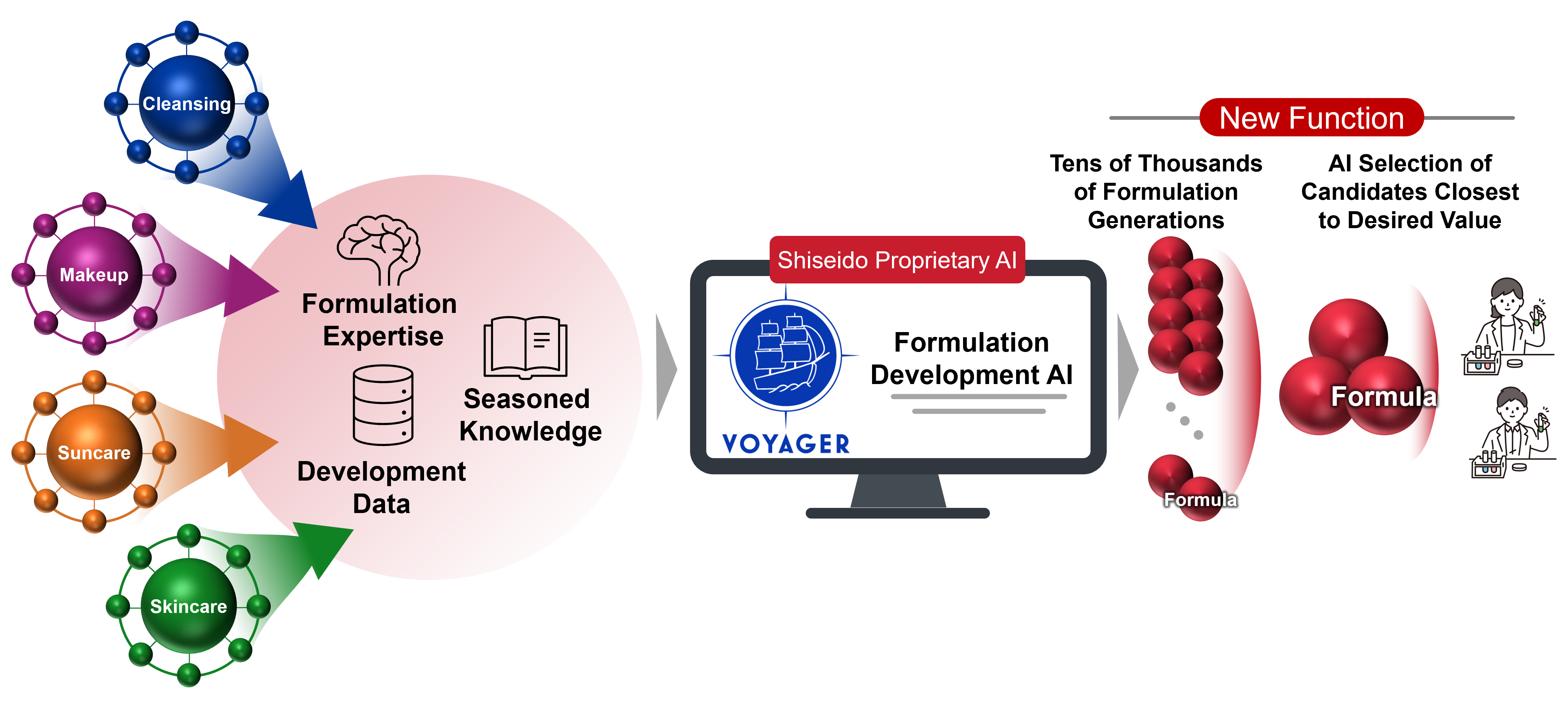 Based on consumer needs and the value that Shiseido’s researchers aimed to deliver, Shiseido has implemented a new AI-powered formulation recommendation function (Figure 1) that consolidates accumulated research insights to generate and evaluate tens of thousands of potential formulations. Previously, the formulation and similar formulation search function announced in 2024 mainly focused on manual searching of past data. The newly added AI functionality can now autonomously propose formulations that incorporate multiple technical approaches. The system learns cosmetic specific knowledge that had been challenging to digitize, such as emulsification mechanisms, interactions between ingredients, and the expertise of veteran researchers, and organizes Shiseido’s proprietary formulation technologies in the upgraded system. This enables technical information across different categories to be combined. The AI generates tens of thousands of candidate formulations and narrows them down to several dozen for researchers to evaluate. Beyond gains in efficiency, this creative AI provides new perspectives and inspiration, further elevating the quality of research. Furthermore, less experienced junior researchers can now develop commercially ready formulations based on AI-generated recommendations. By drawing out the creativity of its researchers, this AI platform has started a new phase in Shiseido’s research and development.