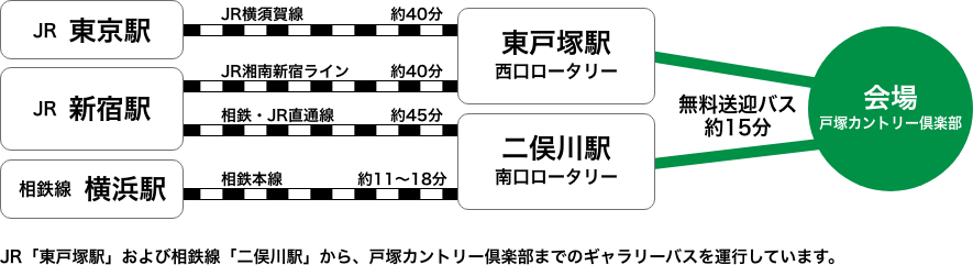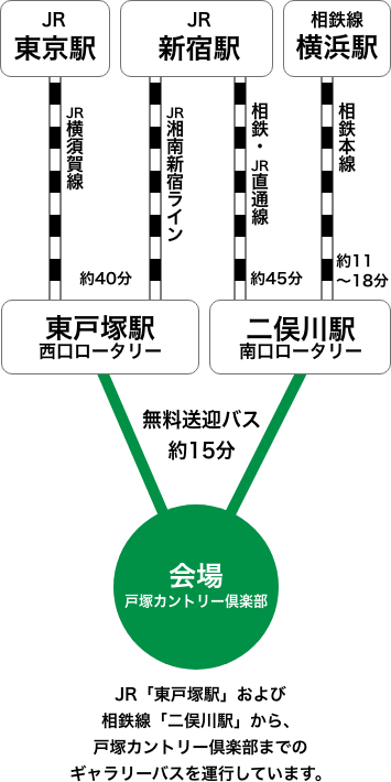 会場の「戸塚カントリー俱楽部」は、横浜市のJR東戸塚駅または相鉄線二俣川駅から、無料の送迎バスで約15分!
