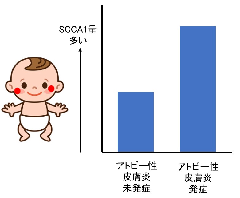 両親のうち少なくともひとりにアトピー性皮膚炎の既往がある117名の乳児(生後2ヵ月、男児62名、女児55名)を被験者として、3歳になるまでの間に定期的に、数回にわたり皮膚科専門医による診察とテープストリッピング法を用いて採取した角層中に含まれるSCCA1量を測定しました。アトピー性皮膚炎・食物アレルギーの発症とSCCA1量の関係性を統計的解析により調べたところ、生後2ヵ月時の頬の角層中のSCCA1の量は、アトピー性皮膚炎を発症していないお子さんと比較して、発症したお子さんにおいては著しく高い結果となりました(図2)。