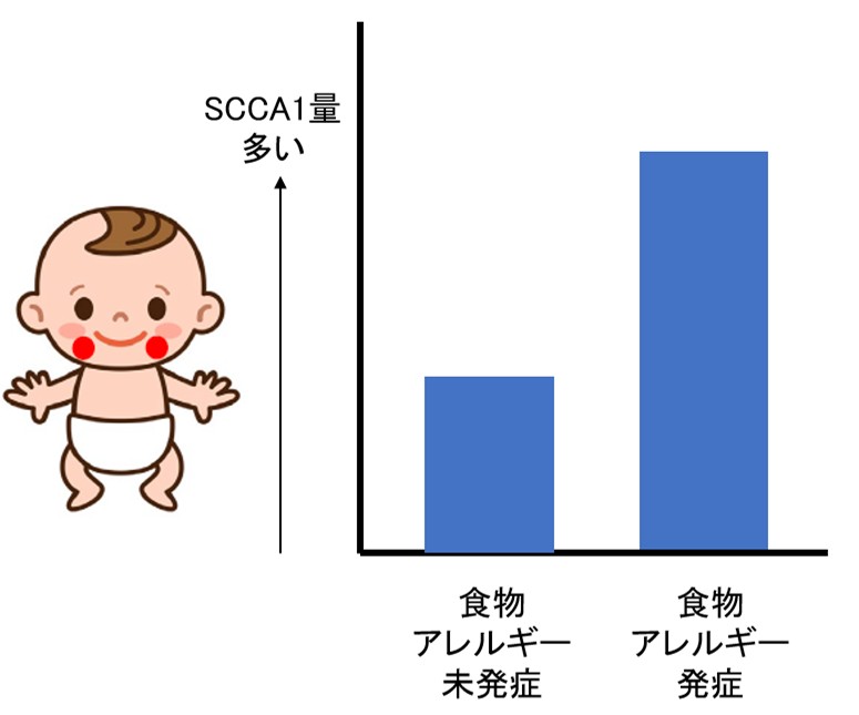 また、生後2ヵ月時の口周りの皮膚の角層中のSCCA1の量が、食物アレルギーを発症していないお子さんと比較をして、発症したお子さんにおいては著しく高い結果となりました(図3)。