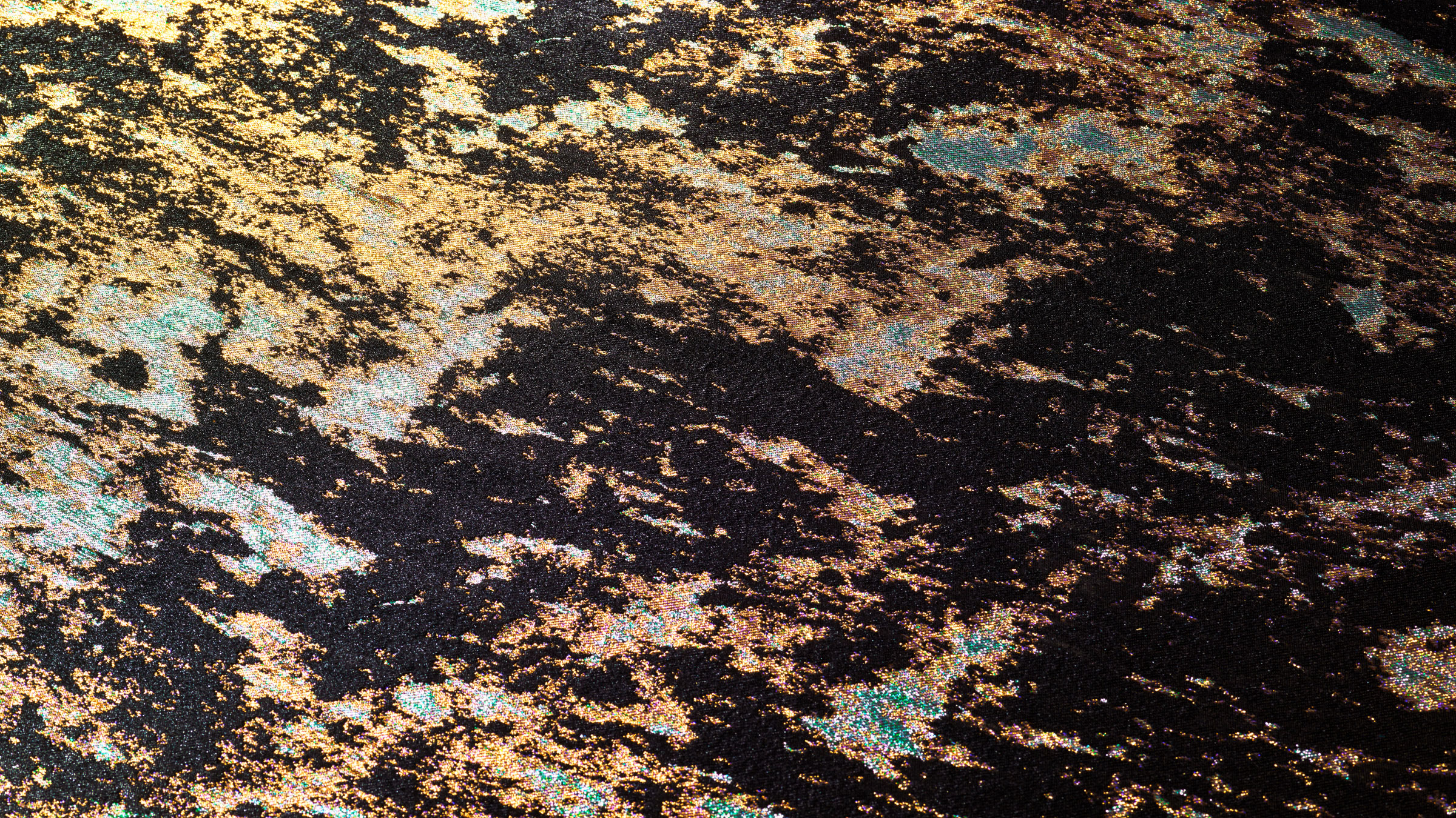 再帰性反射の性質を持つ特殊な箔糸が織り込まれており、光源と鑑賞者の相対的な位置関係によって