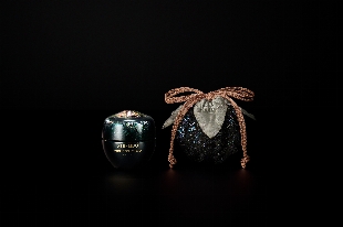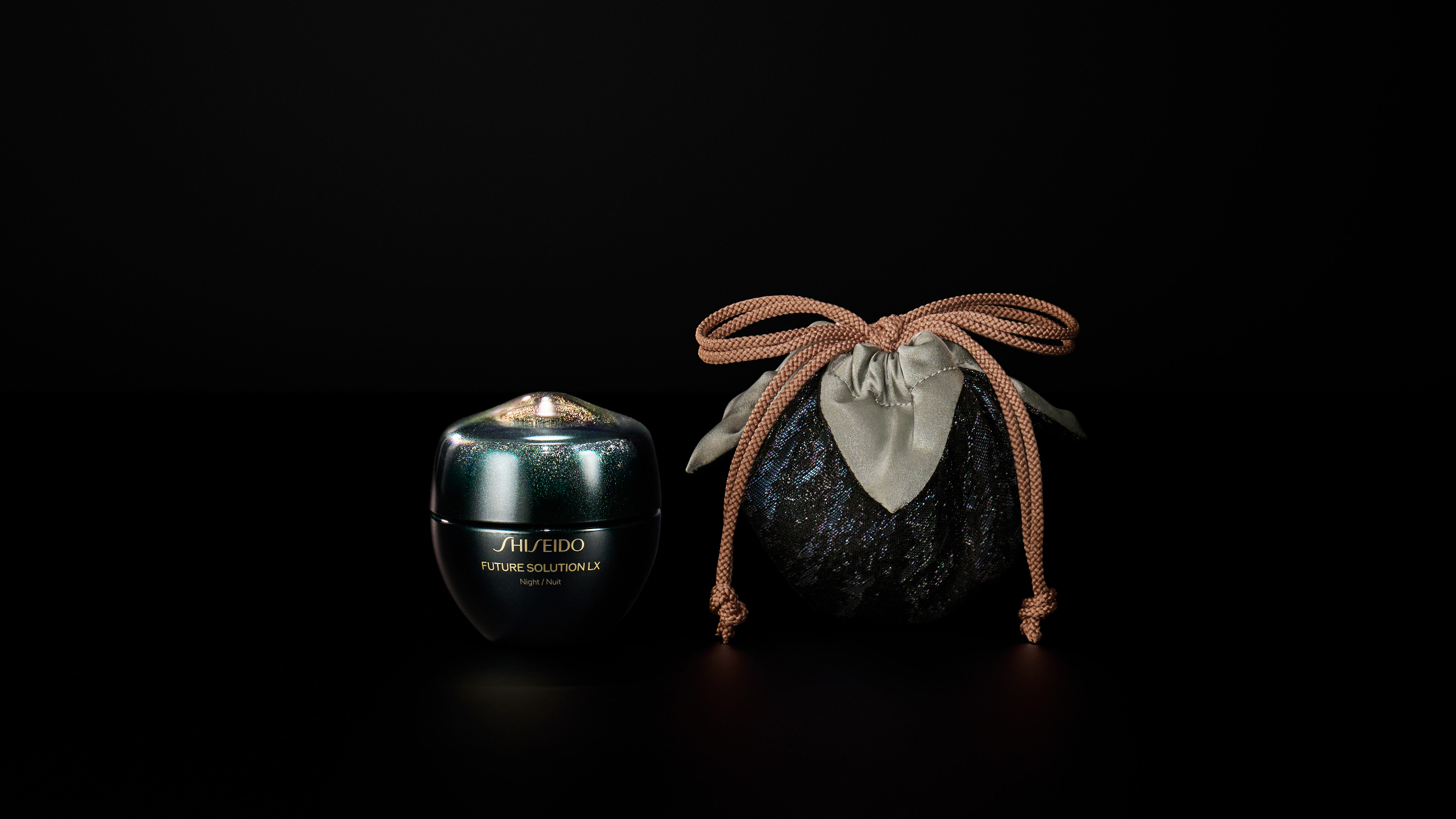 リッチなテクスチャーで夜の肌環境を整えしなやかで引き締まった印象に導くトータルRクリームと、HOSOOが特別にデザインした西陣織で制作をした、仕覆に想を得た袋型ポーチのセット。