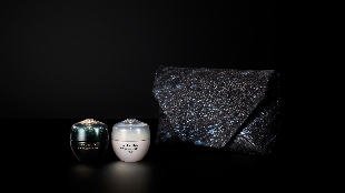 しなやかで引き締まった印象に導き、日中は紫外線や乾燥などのダメージ要因から肌を守り美肌に導く2つのクリームとHOSOOが特別にデザインした西陣織で制作をした、数寄屋袋に想を得たバッグのセット。