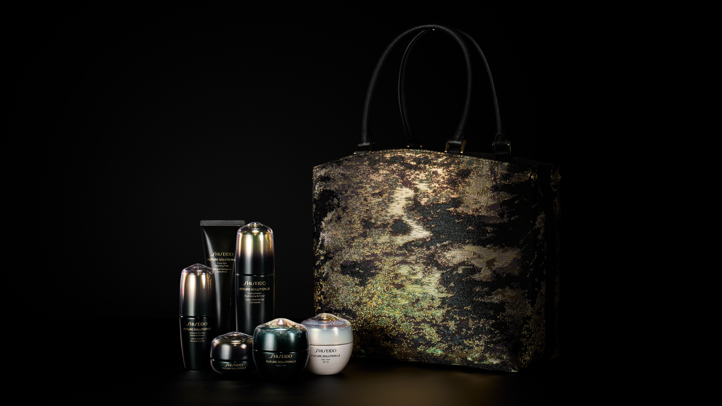 フューチャーソリューションLXフルライン6品と、HOSOOが特別にデザインした西陣織で制作をしたバッグをセット。特注バッグは、一つの茶箱でどのような空間も茶室にかわるように、あらゆる場所を美の空間に変える茶箱をイメージし、フューチャーソリューションLX6品が収納できる2層構造の美しく機能的、かつ個性的なジャパニーズラグジュアリーを体現する唯一無二の一品。