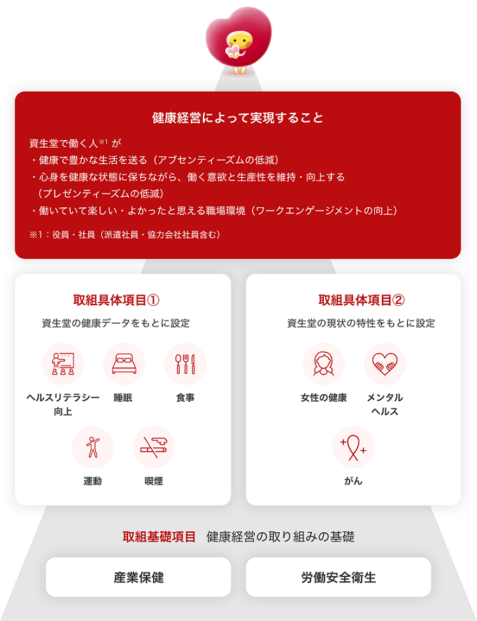 当社は、企業使命「BEAUTY INNOVATIONS FOR A BETTER WORLD(美の力でよりよい世界を)」を実現するため、それを実行する社員やその家族がみずから美しく健やかに生活することが重要だと考え、「資生堂健康宣言」を策定しています。代表執行役 社長 CEO 藤原憲太郎が健康管理責任者となり、ピープル&カルチャー本部と資生堂健康保険組合が協働して各事業所(国内資生堂グループ)をサポートし、社員の健康保持・増進活動を積極的に推進しています。また、健康管理責任者より各役員・部門長・責任者へ働きかけ、社員の自主的な健康への取り組みを支援しています。