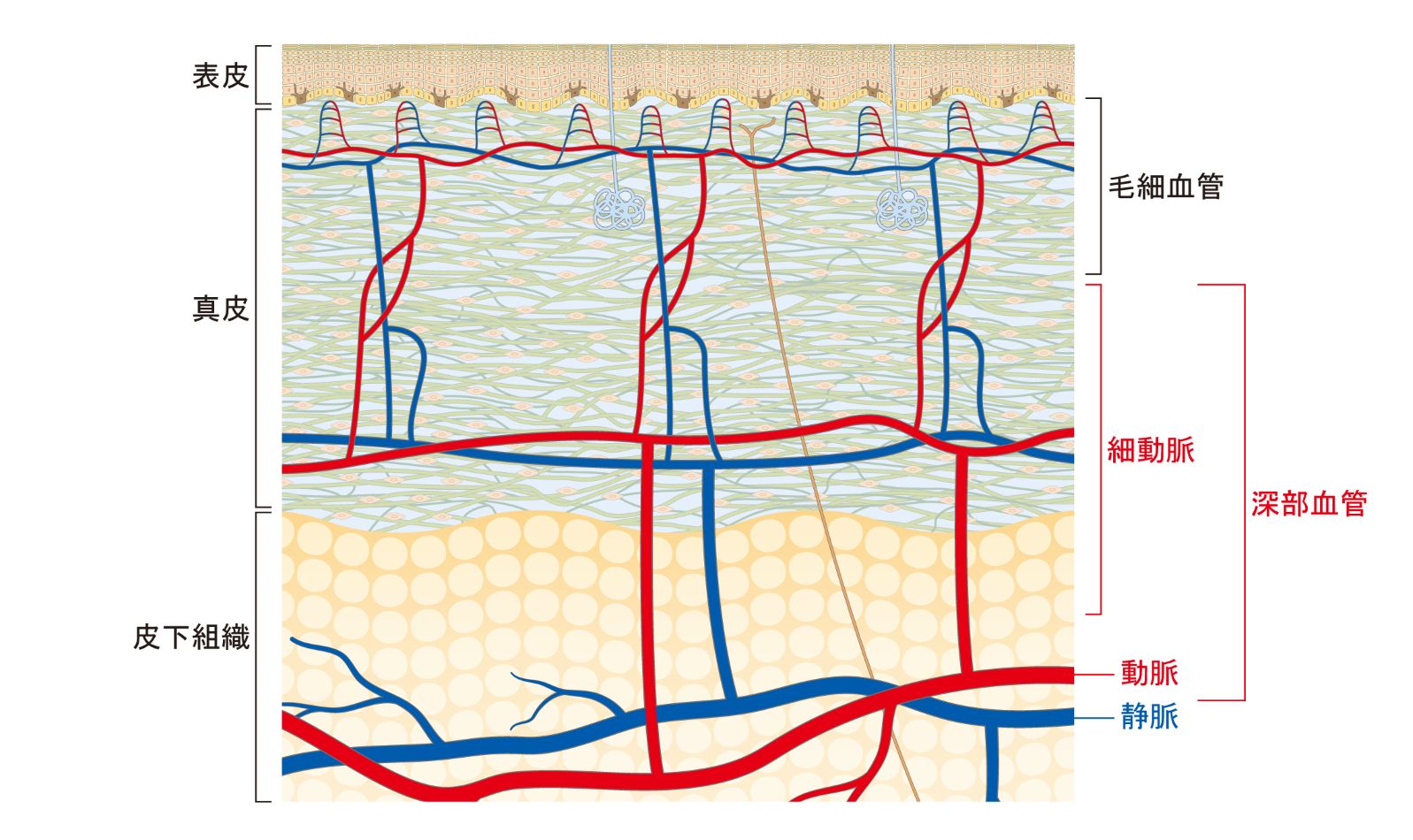 顔の皮下組織を流れる動脈は、首から顔へ血液を運ぶ主要な血管で、肌や筋肉に栄養や酸素を届けています。そこから分かれた細動脈は、血流量を細かく調節し、毛細血管を介して肌のすみずみまで血液を行き渡らせる役割を担っています。