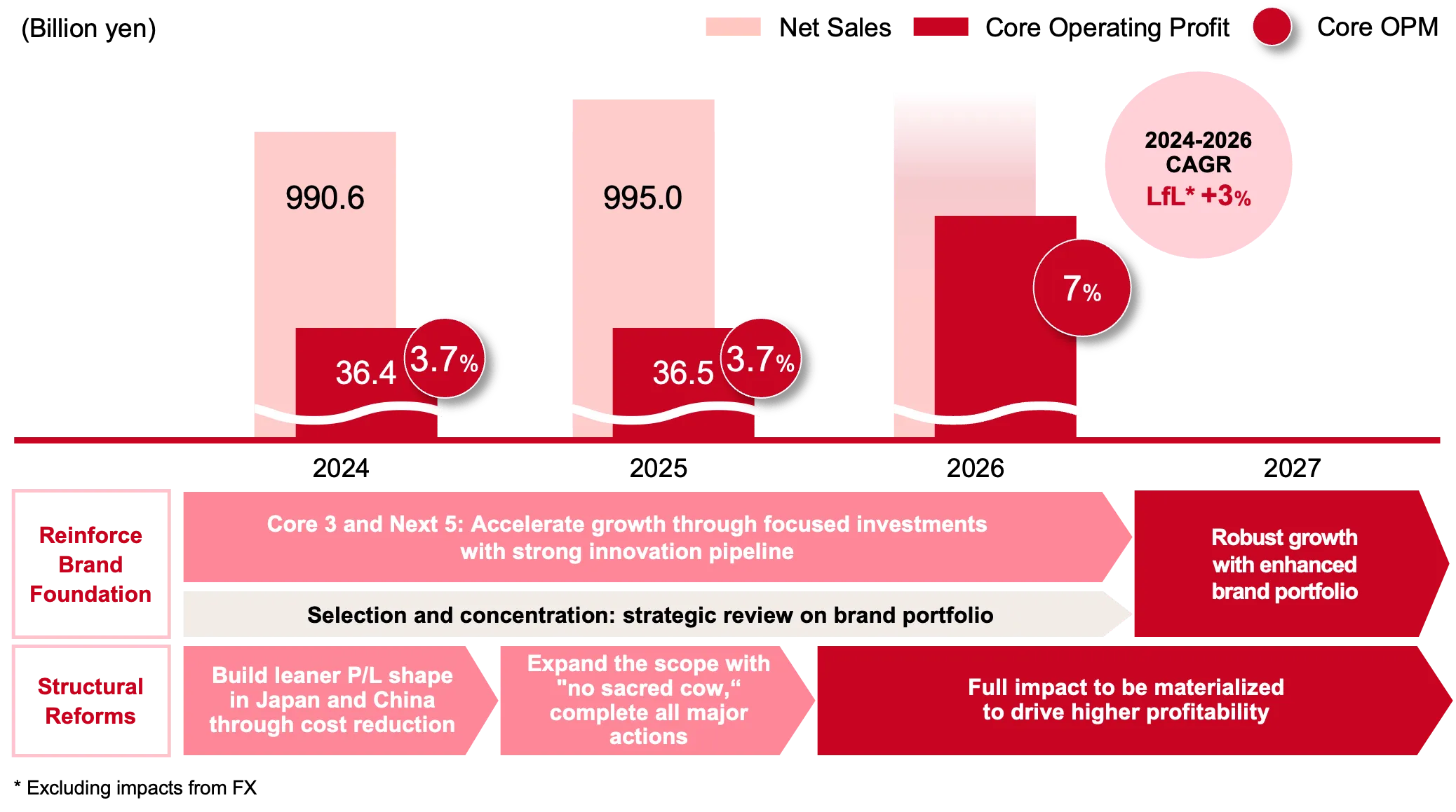 We will build a lean and resilient P/L structure that directly links brand growth to profitability. To achieve this, it is essential to improve profitability across all regions. We will expand the cost reduction initiatives originally set for Japan and China from 2024 to 2025 (over 40 billion yen) to a global scale, targeting more than 25 billion yen in cost savings by 2026, with a primary focus on the Americas and global headquarters. The expertise and successful results from these cost-saving measures in Japan and China will serve as a model for other regions. Our structural reforms present a pivotal opportunity to reassess traditional processes and frameworks, ensuring the successful completion of cost structure reforms. We are committed to accelerating execution across the organization.